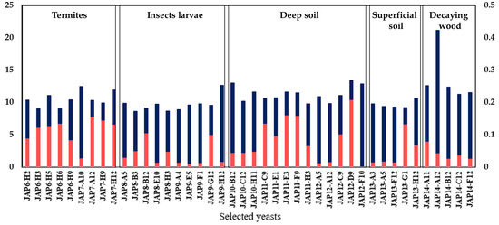 Two criteria were employed to select the best growing yeasts from each plate: (i) selection of strains that reach a higher final growth, regardless of time, and (ii) a selection of strains with faster growth; that is, reach the stationary phase in a shorter time. To ensure diversity of strain origin, yeasts of all plates have been selected for the next experiments, with the exception of JAP5, none of the yeasts of the plate JAP5 presented a growth rate above 50% in comparison with the best strain. Therefore, they were excluded from the next experiments. Thus, after the growth analysis of all yeasts, the 42 best-growing strains were selected. Among these, 9 were isolated from termite samples, 10 came from termite larvae, 13 from deep soil, 5 from superficial soil, and 5 from decaying wood (Figure 2).