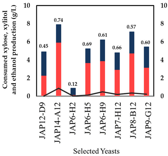 Xylose consumption and xylitol production in a defined medium supplemented with xylose (40 g/L), inoculated at a high cellular density condition, by the eight yeasts previously selected. The yield (g xylitol/g xylose consumed) is represented by the numbers on the top of the columns. Xylose consumption (grey bars); xylitol production (black bars); ethanol production (light grey line).