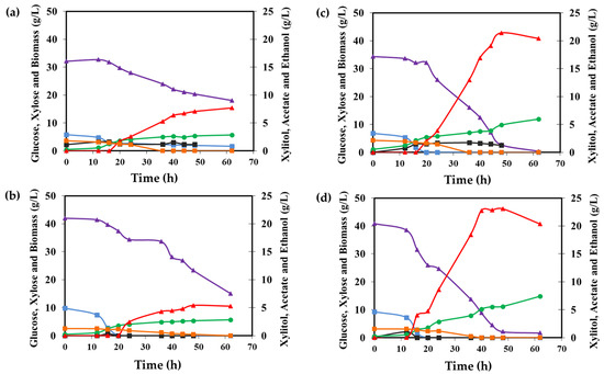 Xylitol production in sugarcane bagasse hydrolysate in a bench bioreactor. (a) M. guilliermondii A3, (b) M. guilliermondii B12, (c) Spathaspora sp. JA1, and (d) W. anomalus 740. Xylose (purple line), xylitol (red line), glucose (orange line), ethanol (black line), acetate (blue line), and biomass (green line). Experiments were performed in duplicate and one replicate is shown.