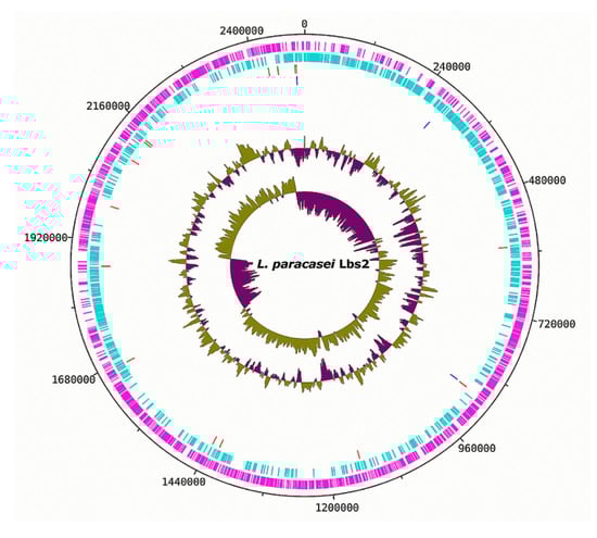 The reassembled genome of the L. paracasei Lbs2 strain was re-annotated with Prokka, resulting in a total of 2380 genes, including 2308 protein-coding, 20 t-RNA, 3 r-RNA, and 49 misc-RNA genes (Figure 1).