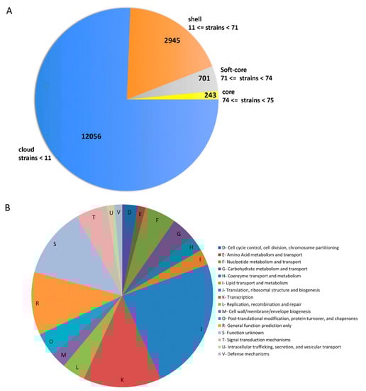 Pan-genome analysis of 75 L. paracasei strains. (A) Pie-chart representing core and accessory genes distribution. (B) Pie-chart representing the distribution of COG categories of 243 core-gene families.