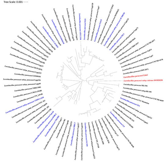 Whole genome phylogenetic tree of L. paracasei strains was inferred using the maximum likelihood method. The tree was built on the basis of the core-genome and it is presented as a cladogram. Complete genomes are marked as blue, while the genome of interest and its closest one are marked as red.