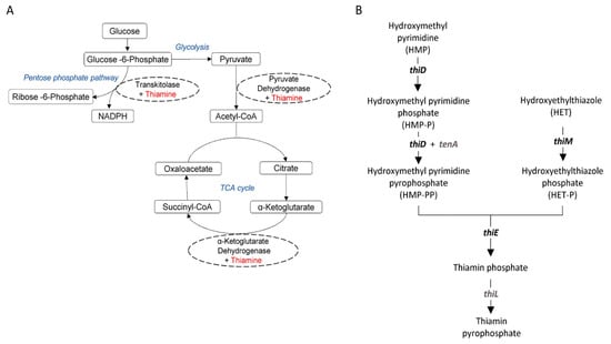 The schematic illustration of pathways. (A) The role of thiamin (marked as red) as a co-factor in major metabolic pathways (marked as blue). (B) Genes involved in thiamin biosynthesis.