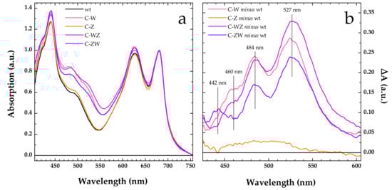 Already during transformants selection, the engineered Synechocystis strains C-W, C-Z, C-WZ and C-ZW, which were expected to constitutively produce the exogenous CrtW and CrtZ enzymes, could be clearly distinguished from the wild-type by simply observing the colour of the cells. When compared with the wild-type, the C-Z strain showed a slightly more brilliant shade of green, while the colour of all the other strains markedly leaned to moss-green (Figure S2). Moreover, the engineered strains expressing CrtW, alone or in combination with CrtZ, displayed a longer doubling time (~24 h) with respect to the wild-type and the C-Z strain, both doubling in ~16 h. The altered colour observed in the engineered strains was further confirmed by measuring whole cells absorption spectra (Figure 1a). All spectra were nearly identical above 660 nm, where the absorption is dominated by Chlorophyll a, and only small variations in intensity could be found in the 600–650 nm interval, linked to slight differences in the phycobilisomes content. Much more pronounced was instead the spectral variation associated to a broadening in the carotenoid absorption region (450–570 nm). This was particularly evident in the strains expressing CrtW (C-W, C-WZ and C-ZW). As highlighted by the difference (engineered strain minus wild-type) spectra shown in Figure 1b, the main spectral changes occurred at 527 and 484 nm, with a shoulder centred at around 460 nm in both C-W and C-WZ, whereas in C-ZW three distinct features were detected at 527, 484 and 442 nm. On the contrary, the absorption spectrum of the C-Z strain, expressing only CrtZ, overlapped to a large extent with the one of the wild-types (Figure 1a), showing only a small, spectrally unstructured, difference covering the 450–550 nm window (Figure 1b). These results were fully consistent with what was previously observed in the temperature-inducible (TI) strains [], confirming that the constitutive expression of the same exogenous CrtW and CrtZ genes also led to significant changes in the carotenoid composition of the engineered strains.