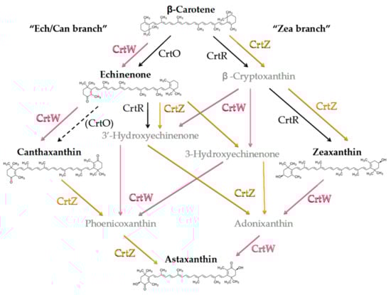 - Harker, M.; Hirschberg, J. Biosynthesis of ketocarotenoids in transgenic cyanobacteria expressing the algal gene for β-C-4-oxygenase, crtO. FEBS Lett. 1997, 404, 129–134. [Google Scholar] [CrossRef]