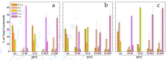 Relative distribution of the main carotenoids in the different engineered Synechocystis strains with respect to the wild-type. (a) Engineered strains constitutively expressing Brevundimonas CrtW and CrtZ (C-W, C-Z, C-WZ and C-ZW) grown at 28 °C. (b) and (c) Engineered strains expressing Brevundimonas CrtW and CrtZ in a temperature-controlled manner (TI-W, TI-Z, TI-WZ and TI-ZW) after two days induction at (b) 33 °C or (c) 39 °C. β-car, β-carotene (orange); Ech, echinenone (peach); Zea, zeaxanthin (yellow); Can, canthaxanthin (light magenta); Asx, astaxanthin (pink). wt, wild-type. Error bars indicate SE.