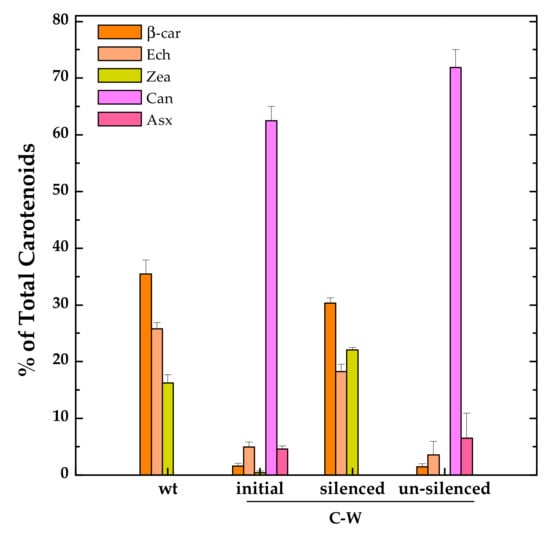 Relative distribution of the main carotenoids in the C-W strain constitutively expressing Brevundimonas CrtW shortly after its generation (“initial” phenotype), after several months of continuous sub-culturing in fresh medium (“silenced” phenotype) and grown to late stationary phase (“un-silenced” phenotype). Also shown is the carotenoid pattern of an exponentially growing wild-type (wt) culture for comparison. Ech, echinenone (peach); Zea, zeaxanthin (yellow); Can, canthaxanthin (light magenta); Asx, astaxanthin (pink). Error bars indicate SE.