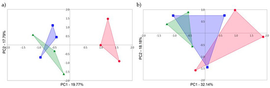 The principal component analysis (PCA) constructed from T-RFLP fluorescent data of fungal communities from Arundo donax rhizosphere collected in (a) 2014 and (b) 2015 in control samples and samples with sewage sludge (SS) in doses of 5 and 15 t/ha. PCA graphs explained a total of 37.56% and 50.32% (respectively) of the variability in the data. PCA was made by combining data from two sampling dates in each year into a single statistical table. Red—control sample; blue—sample with 5 t/ha of SS; green—sample with 15 t/ha of SS.