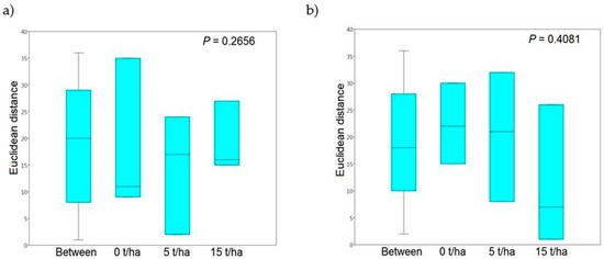 Box plots from One-way ANOSIM with Euclidean distance measure derived from the obtained data using principal component (PC) scores from principal component analysis in Figure 2 in (a) 2014 and (b) 2015 sampling years.