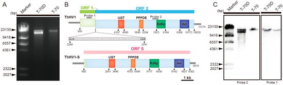 Molecular characterization of Trichoderma harzianum hypovirus 1 (ThHV1) and ThHV1-S. (A) Agarose gel electrophoresis of the dsRNAs extracted from the mycelia of Trichoderma harzianum isolates T-70 and T-70D. (B) Schematic diagrams of the genetic organization of Trichoderma harzianum hypovirus 1 (ThHV1) and ThHV1-S. Note that and two ORFs were overlapped in the 44 nt region of ThHV1, whereas only one ORF was predicted in ThHV1-S. (C) Northern blot detection of dsRNAs from the mycelia of isolates T-70 and T-70D using Probe1 and Probe2, respectively.