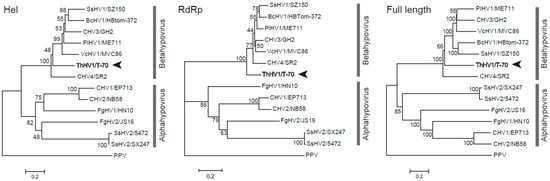 Neighbor-joining trees based on the helicase domain, the RdRp, and the full-length amino acid sequence of ORF2 of Trichoderma harzianum hypovirus 1 (ThHV1) and other hypoviruses. Plum pox virus (PPV) was used as an outgroup in the analyses. The name “ThHV1” was in blod and indicated by arrowheads.