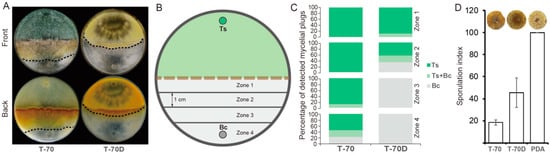 Mycoparasitism ability of Trichoderma harzianum isolates T-70 and T-70D against Botrytis cinerea in dual cultural assay. (A) Colony morphology of dual culture between T. harzianum and B. cinerea on PDA (20 °C, 7 days). Dashed lines indicate the mycelial interface between T. harzianum and B. cinerea colonies. (B) A schematic diagram showing the four zones (1–4) used for mycelia plugs sampling in a dual culture. The mycelial agar plugs were individually transferred to PDA, and subsequently identified to be colonized either by T. harzianum or B. cinerea, or by both, based on the distinct colony morphology of the two fungi after incubation at 20 °C for 10 days. (C) The frequency of the agar plugs from the four zones of dual culture colonized by T. harzianum (dark green) or B. cinerea (gray), or both (light green). “Ts” and “Bc” indicate Trichoderma spp. and B. cinerea, respectively. (D) Efficacy of isolates T-70 and T-70D in suppression of sporulation by B. cinerea on oilseed rape leaf discs (n = 9). A photograph of single leaf disc with sporulation of B. cinerea for each isolate was placed on the top of each bar.