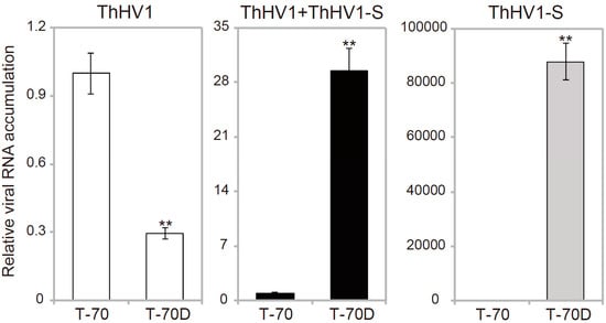 Relative viral RNA accumulation of Trichoderma harzianum hypovirus 1 (ThHV1) and ThHV1-S in T. harzianum isolates T-70 and T-70D. “**” indicates a significant difference between the two isolates according to the Student t test (p < 0.01).