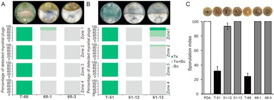The dual-cultural results showed that the mycoparasitic ability of T-70D was significantly decreased in comparison with that of isolate T-70 (Figure 4A). After 10 days, the frequency of Trichoderma colonies (both Ts or Ts + Bc) colonized mycelial agar plugs (MAPs) in the four zones (from zone 1 to zone 4) were 100, 100, 100, and 77.8%, respectively, in the dual cultures of isolate T-70 + Bc, but only 100, 66.7, 0 and 0%, respectively, in the dual cultures of T-70D + Bc (Figure 4C).