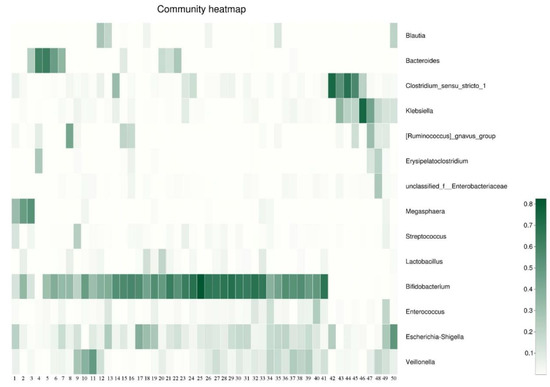 The bacterial distribution was characterized in terms of the relative taxonomic abundances. A total of 21 phyla, 130 families, and 258 genera were found from 50 infants’ samples at 6 months postpartum. There were 54 genera present in at least 20% of infants’ gut microbiotas, and using 0.25% relative abundance as a cutoff, 21 genera met these conditions (Table S1). Figure 1 shows taxonomic compositions of the dominant bacteria on the genus level (relative abundance >1%). For the relative abundance, there were 14 genera above 1%, and the 10 most abundant genera were Bifidobacterium (38.18%), Escherichia-Shigella (10.63%), Veillonella (8.37%), Clostridium sensu stricto 1(7.64%), Klebsiella (5.37%), Bacteroides (5.3%), Ruminococcus gnavus group (3.29%), Megasphaera (3%), Enterococcus (2.88%), and Lactobacillus (1.72%).