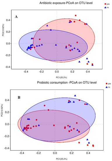 Variations in infants’ gut microbiota compositions among different groups (beta-diversity) were visualized by PCoA based on Bray–Curtis dissimilarity matrices on OTU level (Figure 2). Differences were further tested with PERMANOVA. Not surprisingly, the gut microbiota was not significantly separated based on antibiotic exposure (R2 = 0.03, adjust p = 0.24), probiotic consumption (R2 = 0.03, adjust p = 0.24), feeding type (R2 = 0.02, adjust p = 0.36), or delivery mode (R2 = 0.02, adjust p = 0.56).