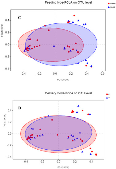 Principal coordinate analysis (PCoA) was conducted according to the Bray–Curtis distance matrix calculated using OTU information from each sample. Permutational multivariate analysis of variance (PERMANOVA) was conducted to analyze the explanative degree of different grouping factors on the sample difference at the OTU level using the Bray–Curtis distance matrix. In PERMANOVA, we controlled confounders, including mode of delivery, feeding type, probiotic consumption, antibiotic exposure, and adherence to doing the month behaviors. Beta diversity metrics were analyzed based on mode of delivery, feeding type, probiotics consumption, and antibiotic exposure.