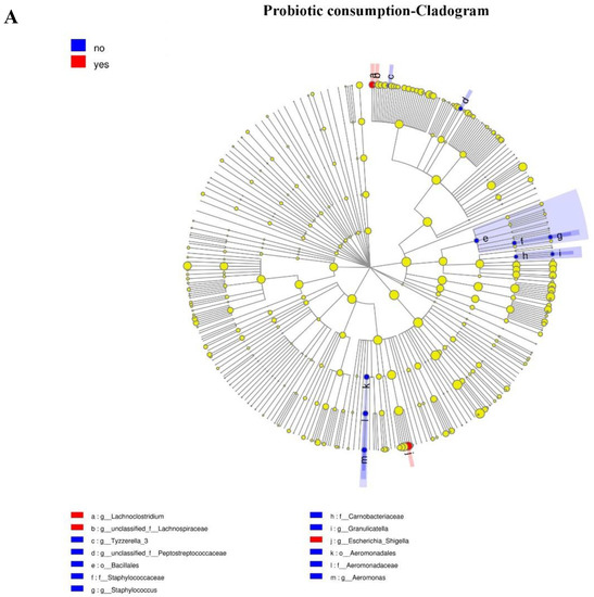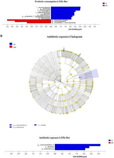 Taxonomic representation of statistically and biologically consistent differences between different groups ((A) probiotic consumption; (B) antibiotic exposure; (C) delivery mode; (D) feeding type). Differences are represented by the color of the most abundant genus. The diameter of each circle is proportional to taxon abundance; from inside to outside circle indicate the phylum to genus level in turns (g: genus; f: family; o: order; c: class). Histogram of the linear discriminant analysis (LDA) scores for differentially abundant genera. The threshold on the logarithmic LDA score for discriminative features was set to 2.0; the larger the LDA score, the greater influence of species abundance on the difference between two groups. ((A) Probiotic consumption: More abundant in no consumption group: Aeromonadaceae, Aeromonas, Aeromonadales, Tyzzerella, Staphylococcaceae, Bacillales, Staphylococcus, Peptostreptococcaceae, Carnobacteriaceae, and Granulicatella. More abundance in consumption group: Escherichia_Shigella, Lachnoclostridium, and Lachnospiraceae. (B) Antibiotic exposure: More abundance in no antibiotic exposure group: Lachnoclostridium and Bacillales, Anaerotruncus. (C) Delivery mode: More abundance in Cesarean section group: Streptomycetaceae, Streptomycetales and Streptomyces. More abundance in vaginal delivery group: Bacteroidaceae, Bacteroides, Megamonas, Thermaceae, (f)Atribacteria Incertae Sedis, (o)Atribacteria Incertae Sedis Thermus, (c)Atribacteria Incertae Sedis, Candidatus Caldatribacterium, Parabacteroides, Porphyromonadaceae, Deinococci, Thermales, Rhodobacterales, Rhodobacteraceae, (g)Bacteroidales S247 group, (f)Bacteroidales S247 group, Deinococcus Thermus, Dolosigranulum, and Achromobacter. (D) Feeding type: More abundance in breast-fed group: Burkholderiales and Epulopiscium. More abundance in mixed-fed group: Dysgonomonas, Solobacterium, and Tissierella).