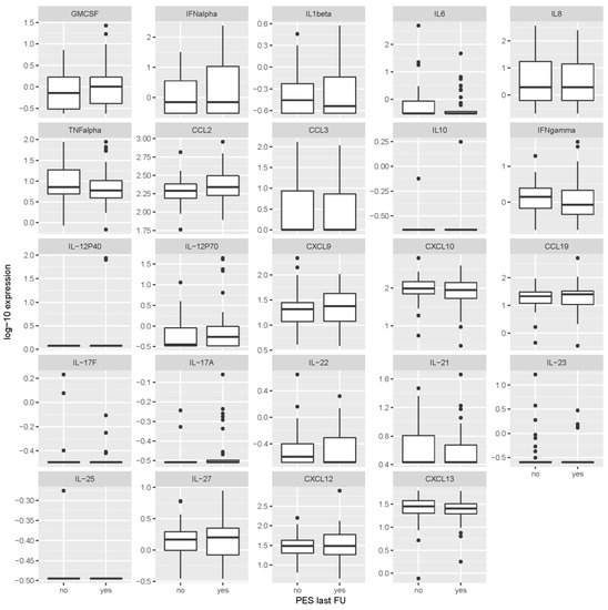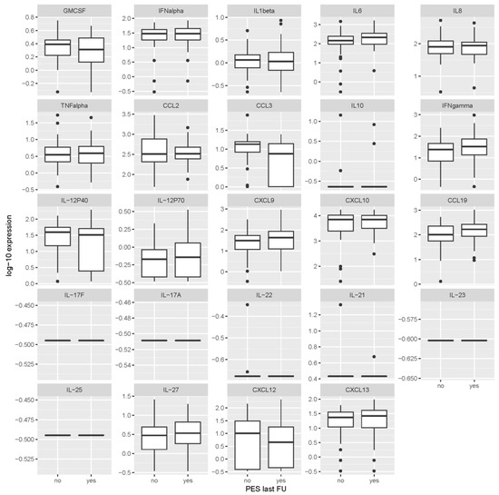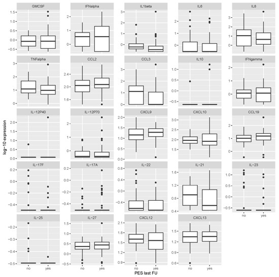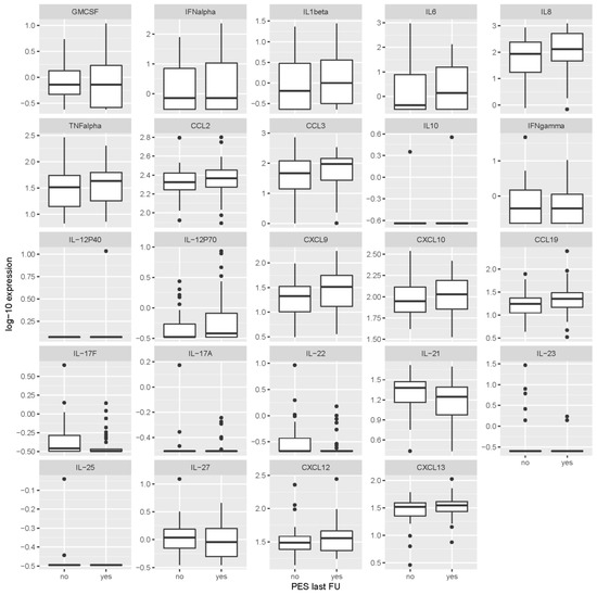Levels of cytokines/chemokines in serum obtained 2 months after first sampling according to the presence or absence of post-encephalytic syndrome at the last follow-up visit (2–7 years after tick-borne encephalitis). Concentrations are in ng/mL for IL-17F, IL-23, IL-25 and IL-27, and in pg/mL for all other inflammatory immune mediators. PES last FU = post-encephalitic syndrome present at last follow-up visit.