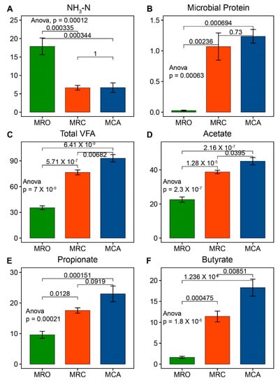 Rumen fermentation parameters were shown using bar charts made in R (v3.6.0) by the ‘ggplot2′ package. Anova tests were used for significance calculations after the detection of homogeneity of variance. Following the check of global test significance, a post-hoc analysis (Tukey’s HSD test) was performed to determine which groups of independent variables differ from the other groups.
