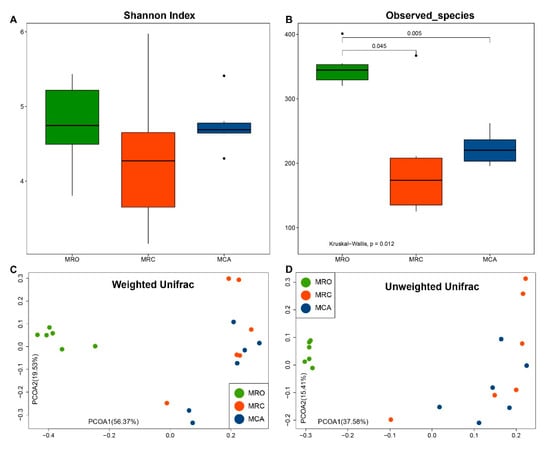 The early supplementary solid diet impacted on Alpha and Beta diversity of rumen microbiome in goat kids. (A,B) The Shannon Index and Observed species. Alpha diversity of the rumen microbial data were tested using the Kruskal-Wallis test and a post-hoc Dunn Kruskal-Wallis multiple comparison, and the Bonferroni method was used for p value correction. Principal coordinate analysis (PCoA) of the community membership based on the weighted (C) and unweighted (D) UniFrac distance are depicted with the green cycles as the MROgroup, the red cycles as the MRC group and the blue cycles as the MCA group. Although diversity (Shannon index) was not different (p = 0.372), significance of microbial richness was observed among MRO, MRC and MCA groups of rumen samples (p = 0.012). Significances in community structure among the 3 groups were detected (Weighted Unifrac ANOSIM, R = 0.68, p < 0.05; UnWeighted Unifrac ANOSIM, R = 0.69, p = 0.001). The MRO formed a distinct cluster on the left side, while the MRC and MCA were closely clustered on the right side of the PCoA plot. MRO = milk replacer; MRC = milk replacer + concentrate; MCA = milk replacer + concentrate + alfalfa; ANOSIM: Analysis of similarity.