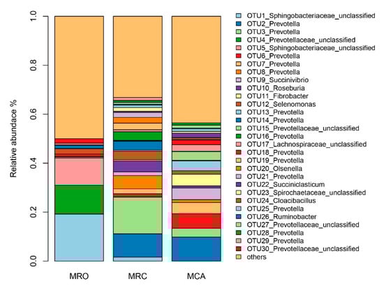 At the OTU level, there were 281 OTUs that were significantly different between the three groups (Table S6), and 16 taxa in the top 30 were found significant. The top 30 most abundant bacterial taxa accounting for 57.77% of all reads are displayed on the stacked bar charts (Figure 3). Among the top 30 OTUs, 14 belong to the genus Prevotella, and 4 were in the genus unclassified Prevotellaceae. The OTUs belonging to unclassified Sphingobacteriaceae (OTU1 and OTU5), unclassified Prevotellaceae (OTU4 and OTU30) and Cloacibacillus (OTU24) were greater in the MRO group. The OTUs affiliated with Prevotella (OTU2, OTU6, OTU13,) in the top 30 had a higher abundance in the MRC and MCA groups. The MRC group was found abundant with Roseburia (OTU10), Olsenella (OTU20) and Prevotella (OTU21). The bacteria belonging to the genera Prevotella (OTU6 and OTU13) Succinivibrio (OTU9), unclassified Prevotellaceae (OTU15), Succiniclasticum (OTU22) had the highest relative abundances in the MCA group.