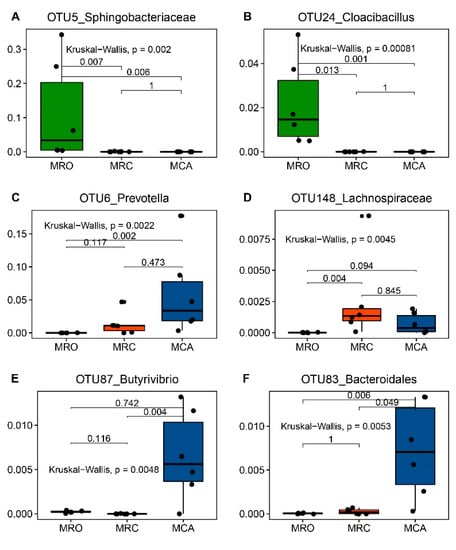The highlight signature microbiota identified by AUCRF for differentiating MRO, MRC and MCA. The OTU5 (unclassified Sphingobacteriaceae), OTU24 (Cloacibacillus) had high abundances in MRO group (A,B). OTU148 (unclassified Lachnospiraceae) was higher in MRC and MCA (D). Other OTUs including OTU6 (Prevotella), OTU87 (Butyrivibrio) and OTU83 (unclassified Bacteroidales) were significantly enriched in the MCA (C,E,F). All the OTUs abundances were tested using the Kruskal–Wallis test and a post-hoc Dunn Kruskal-Wallis multiple comparison with the Bonferroni method for p value correction being used. The black dots within each bar were values from individual animals, and the black lines within each bar represented the medians. MRO = milk replacer; MRC = milk replacer + concentrate; MCA = milk replacer + concentrate + alfalfa; AUCRF: Random Forest based on optimizing the area-under-the receiver operator characteristic curve (AUC).
