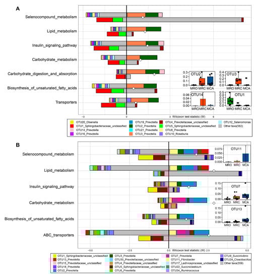 Fish Taco was performed to identify the corresponding microbiota driving the functional shifts between supplementary the regimes. There were no differences of normalized abundance of functions between the MRC group as a control and the MCA group as a case based on the Wilcoxon rank-sum test. When the MRO group was used as a control and the case was used as the MRC and MCA groups separately, 31 and 37 significant pathways were found, respectively. Notably, 21 shared functions were also observed between the two comparisons, including metabolism of nutrients (lipid, amino acid, carbohydrate, vitamin, peptidoglycan, terpenoids and polyketides), and the pathway of the endocrine systems cellular processes. (Figure 5 and Figures S8 and S9). To better understand the driver OTUs functions, we identified all sequences with the highest scores contained in the NCBI BALSTN database (File S2). Across all significant functions enriched in the MRC group, a set of Prevotella bacteria including OTU3 (Prevotella copri DSM), OTU2 (Prevotella brevis strain GA33), OTU14 (Prevotella histicola) and OTU16 (Prevotella ruminicola) (occurrence 100%, 83.3%, 60% and 13.3%) were the main drivers (Figures S8 and S9). While in the MCA group, the function shifts were driven by a convoluted outcome of Fibrobacter and Prevotella including, OTU11 (Fibrobacter succinogenes), OTU2, OTU3, OTU7 (Prevotella ruminicola) and OTU13 (Prevotella brevis strain GA33) (their occurrence 100%, 100%, 100%, 30.3% and 15.2%). Although the selenocompound metabolism pathway was enriched in MRC and MCA compared to the MRO, the set of OTUs that drove this enrichment of the two feeding regimes as well as the level of contribution to each species differed, with OTU2, OTU3 and OTU14 driving the shift in the MRC group and a set of OTU2, OTU3, OTU11, and OTU13 in the MCA group (Figure 5). These enrichments were attenuated by very different bacteria in the MRC (OTU20, OTU16, OTU8, OTU10, OTU12 and OTU14) and the MCA (OTU15, OTU6, OTU7, OTU17, OTU22 and OTU9). Other highlight pathways such as lipid and carbohydrate metabolism, Biosynthesis of unsaturated fatty acids and transporters had similar patterns. In addition, the MRO enriched microbiota, including unclassified Sphingobacteriaceae (OTU1 and OTU5 Olivibacter sitiensis) and Cloacibacillus (OTU24 Cloacibacillus porcorum), were strongly depleted by solid diets.