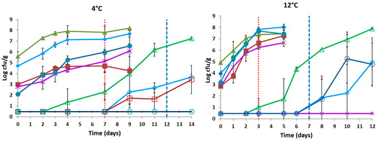 Growth curves of B. thermosphacta (▲) or (△), Pseudomonas spp. (♦) or (◊), LAB (*) or (x), Enterobacteriaceae (●) or (○), yeasts/molds (■) or (□), on untreated (closed symbols), or HPP-treated (500 MPa/10 min) (open symbols) chicken fillets, respectively, during storage under vacuum package at 4 °C (left) and at 12 °C (right). Vertical red dotted line: end of the control samples shelf-life according to sensory analysis. Vertical blue dashed line: end of the HPP-treated samples shelf-life according to sensory analysis. Error bars represent the mean values ± standard deviation.