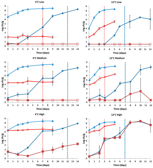 Growth curves of TVC on untreated (▲) or HPP–treated (500 MPa/10 min) (♦) chicken fillets and of L. monocytogenes on untreated (x) or HPP–treated (500 MPa/10 min) (■) chicken fillets inoculated with low, medium, and high inoculum level of a 4-strain cocktail of Listeria monocytogenes and stored under vacuum package at 4 °C (left) and at 12 °C (right). Open symbols (□) indicate absence of the pathogen after applying the enrichment method. Vertical red dotted line: end of the control samples shelf-life according to sensory analysis. Vertical blue dashed line: end of the HPP-treated samples shelf-life according to sensory analysis. Error bars represent the mean values ± standard deviation.
