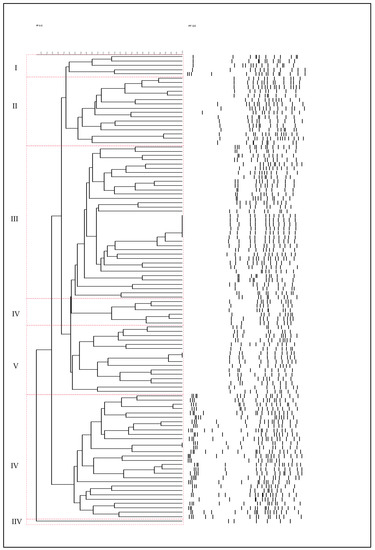 The dendrogram obtained after cumulative image analysis of PFGE patterns using a coefficient of similarity of 60%, resulted in seven different groups (Figure 3). In Table 1, the prevalence of the different groups related to the different conditions (untreated and treated with HPP and storage temperatures) is summarized. In detail, Group I had five isolates all recovered from the end of cold storage of HPP-treated samples. Group II encompassed 16 isolates and the diversity of the recovered PFGE profiles was observed mostly at control samples stored at both temperatures. Additionally, no isolates were recovered from control samples at 12 °C. Group III was the most abundant in terms of isolates (37). In detail, two PFGE profiles were found in HPP samples (day 3 and end of storage), while nine different profiles were recovered from the control samples at 4 °C. At 12 °C no isolates were recovered from control samples, whereas 26 isolates were recovered from HPP samples. Group IV consisted of six isolates recovered mainly from control samples for both temperatures at 0 h and at the end of storage. Only one isolate in this group was recovered from an HPP sample on the third day of storage at 4 °C. Group V contained mainly isolates (16) from control and HPP-treated samples from 12 °C. Group VI consisted of 29 isolates, where no isolates were recovered from HPP samples from 12 °C. The last group (VII) consisted of a single isolate recovered from the end of 12 °C of control samples. A representative number of isolates from the above seven groups were subjected to 16S rRNA gene sequencing, revealing that all groups were assigned to B. thermosphacta at a percentage over 99% (Table S1).