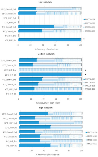 For the samples stored at 12 °C the initial distribution of the strains for the three inocula was FMCC–B–131 (ca. 22–38%) > FMCC–B–129 (ca. 14–39%)> FMCC–B–128 (ca. 22–29%)> and FMCC–B–133 (ca. 12–22%), while at the end of storage differences were observed between the three inoculum levels in terms of recovery percentages of each strain. However, in contrast to the cold storage, no specific recovery pattern in strain distribution was observed for control samples (Figure 4). After HPP, no colonies were recovered after enrichment in the low inoculum case, FMCC–B–128 was the only recovered strain (after enrichment) in the medium inoculum case, while at high inoculum the recovered strains were FMCC–B–128 and FMCC–B–129 in a ratio of 1:1. Finally, at the end of storage at 12 °C no strains were recovered after enrichment in the low inoculum case, in the medium inoculum case the only recovered strain (after enrichment) was FMCC–B–131, while at high inoculum all strains but FMCC–B–133 were recovered. The latter finding is of interest, since the same strains were absent or present in the high inoculum case after cold storage of HPP–treated samples. For comparison reasons, it has to be noted that in the cases that the isolates were recovered after enrichment the presence of each strain has to be characterized as random and the appearance of the strains in the figures should be interpreted as qualitative information rather than % contribution in the samples [25].