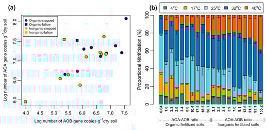 The variation (a) in ammonia oxidizing archaea (AOA) and ammonia oxidizing bacteria (AOB) abundances (qAOA and qAOB, respectively) among organic and inorganic farm and influence of AOA to AOB ratios (b) on soil proportional nitrification across a temperature range of 4 to 40 °C. Error bars represent the standard error (n = 3) for nitrification potential at each temperature.