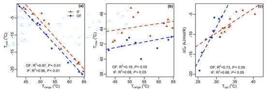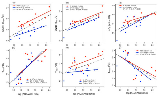 The influence of AOA to AOB ratios on (a) mean optimum temperature for nitrification estimated by the macromolecular rate theory (MMRT) model; (b) optimum temperature estimated by the square root theory (SQRT)) model; (c) change in heat capacity associated with the temperature dependence of nitrification (); (d) theoretical apparent minimum temperature (Tmin) for NP activity; (e) maximum temperature (Tmax) for NP activity; and (f) temperature range (Tmax–Tmin). “OF” and “IF” represent the soil samples from organic and inorganic fertilized soils, respectively.