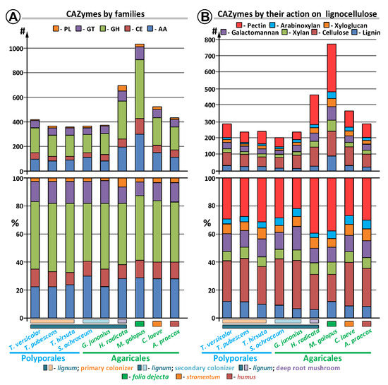 Given the different physicochemical properties of the substrate occurring at the different stages of wood degradation and SOM decomposition, it is not surprising that fungi operating at these stages adopted different decomposition strategies. Generally, these strategies can be distinguished based on the profile of lignocellulolytic enzymes (carbohydrate-active enzymes—CAZymes) secreted by fungi during the decomposition process, and many previously published studies demonstrated a strong relationship between the CAZyme content of fungal genomes with their degradation ability [4,12,13,14,15].