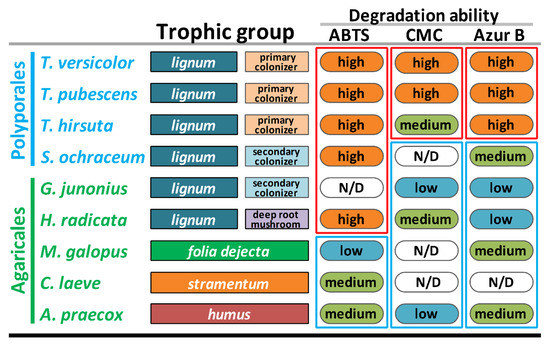 As can be seen in Figure 4, S. ochraceum, demonstrating high degradation ability toward ABTS, forms a group with all fungi (except G. junonius) that have lignum as a primary substrate. In contrast, medium degradation ability toward Azur B placed S. ochraceum in the group with the litter decomposers and humus saprotrophs, apart from the primary colonizers.