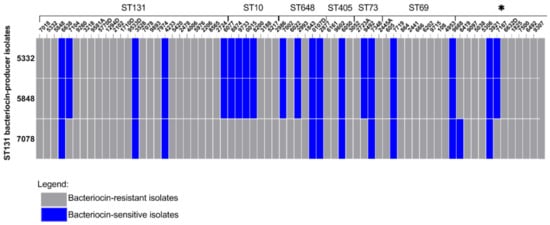 Bacteriocin activity among ST131. The graph shows the bacteriocin activity of the three bacteriocin-producer ST131 isolates against other isolates that belong to ST131, ST10, ST648, ST405, ST73, ST69, ST297 and ST414. The * indicates the singleton isolates. The dark blue hits indicate the isolates that were sensitive to bacteriocin and the grey hits indicate bacteriocin-resistant isolates.