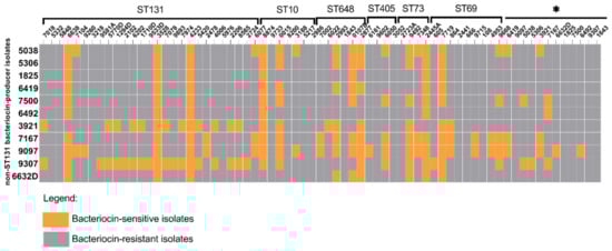 Bacteriocin activity among non-ST131 isolates. The graph shows the bacteriocin activity of non-ST131 isolates against isolates from different ST types. The * indicates the singleton isolates. Orange represents isolates that were sensitive to the bacteriocin produced by the non-ST131 isolates and grey represents the bacteriocin-resistant isolates.
