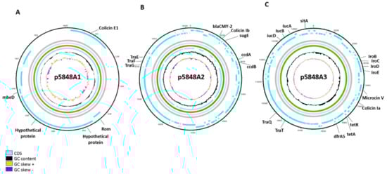 Plasmid p5848A1 containing the colicin E1 gene has a similar structure as other colicin E1 containing plasmids, including the presence of the meb operon, which plays a role in conjugation similar to the traY genes of IncF plasmids []. The plasmid p5848A2, containing colicin Ib, was found to be highly similar to a plasmid (pSTM709) present in Salmonella enterica subspecies Typhimurium isolated in Uruguay, but had two additional regions encoding mobile elements, hypothetical proteins, and the RepY and InC proteins, that are absent from the pSTM709 plasmid. The presence of colicin Ib conferred a competitive advantage in the gut to Salmonella enterica []. The presence of genes encoding the membrane lipoprotein blc and the efflux pump sugE flanking the beta-lactamase blaCMY-2 gene, is similar to the structure identified for other plasmids among pAmpC-producing E. coli from poultry and fecal human samples []. The largest plasmid p5848A3, harboring both resistance and virulence genes, carries the colicin Ia and microcin V genes. Notably, colicin Ia is induced by the SOS system, while the microcin V is induced by iron-limited conditions. The same plasmid also carries several genes for iron uptake, consistent with a previously described association between siderophores and salmochelin []. The combination of these genes on the same plasmid may give an advantage to survive in and to colonize iron-limited environments as the urinary tract. Furthermore, the presence of colicin Ia and microcin V genes on the same plasmid was described in another study as a non-aleatory evolution that may have happened to increase the killing range and/or to increase the fitness advantage of bacteria in different environments [].