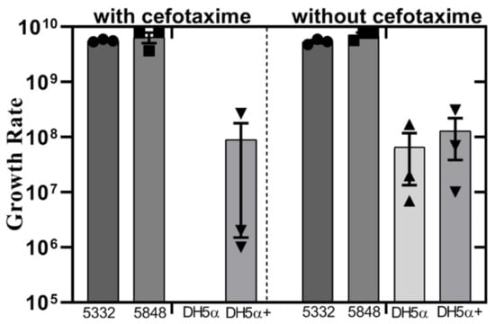 Growth rate of isolates with or without bacteriocin and resistance genes containing plasmids in the presence or absence of cefotaxime. Results showing the growth rate (UFC/mL) of each competitor. Squares, triangles and circles indicate replicates. No statistically significant difference was found when comparing growth rates of DH5α (wild type) and DH5α+ (transformant strain).