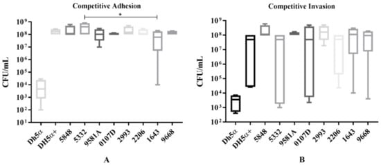 Competitive adhesion and invasion assay. (A) Adhesion to HEK-293 (human embryonic kidney cell line) calculated in CFU/mL. (B) Invasion of HEK-293 for the same isolates. In both assays, results obtained from the plasmid containing isolates 5332 and 5848 were compared with other ST131 clinical isolates (9581A, 2206, 0107D), with ST648 (2993), ST354 (1643), ST297 (9668) and ST69 (7719) isolates, and with both the parental DH5α and the transformant DH5α+ strains. The * indicates a statistically significant difference (p ≤ 0.05).