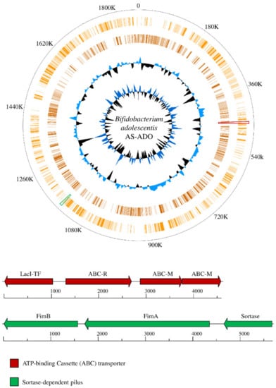 Interestingly, detailed cataloguing of TUGs of B. adolescentis AS-ADO allowed the identification of genes, present only in AS-ADO, that may increase the ecological fitness of the strain based on their in silico predicted function. In this context, AS-ADO encodes a unique ATP-binding Cassette (ABC) transporter composed by three subunits, i.e., two permease proteins and a solute-binding protein predicted to be involved in maltose or trehalose uptake, flanked in the genome by a gene encoding a unique regulatory protein belonging to the LacI family (Figure 2). This B. adolescentis specific gene cluster, which is homologous with that found in Bifidobacterium moukalabense DSM 27321, may enhance the ecological fitness of AS-ADO to grow in the gut of its host, the pygmy hippopotamus. Furthermore, the same strain harbors a gene encoding a unique large fimbrial protein and located between a gene specifying a small fimbrial protein and a sortase-encoding gene already classified in the B. adolescentis species [42]. This sortase-dependent pilus locus may improve the adhesion of cells to the intestinal mucosa of its host, thereby perhaps allowing or supporting persistence and colonization of AS-ADO.