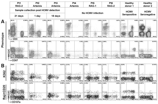 NK cells play an important role in the control of HCMV. Biron et al. reported an adolescent with a marked susceptibility to herpesviruses. The patient had normal immune functions, except for an extreme deficiency of NK cells. This case report suggested the importance of NK cells in controlling herpesviruses infections including active HCMV infection [10]. We have shown that NK cells can efficiently inhibit HCMV transmission in cell cultures and that NK cells degranulate and secrete IFN-γ [11,12,13]. However, the anti-HCMV role of NK cells from SCID patients with defective RAGs or DCLRE1C (RAGs−/DCLRE1C−-NK) is unknown.