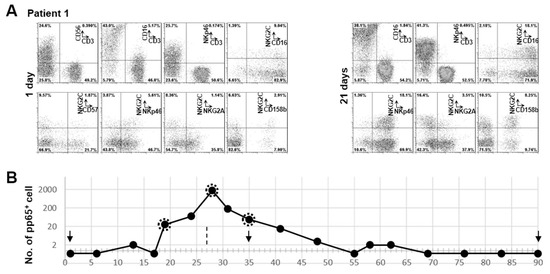 The live virus was firstly detected from urine by cell cultures (day 1). The pp65 positive polymorphonuclear leukocytes can be detected in the following 62 days and the positivity peaked at day 28. The highest amount of pp65 positive cell was 1750 per half million of polymorphonuclear leukocytes at day 28. Live virus could be isolated by culturing polymorphonuclear leukocytes from peripheral blood with indicator cells at days 19, 28 and 35. Urine cultures were negative at days 35 and 90. We captured the expansion of NKG2C+ NK cells (Figure 3A) with the increased viral load in the peripheral blood. Bone marrow transplantation was performed on day 27 (Figure 3B).