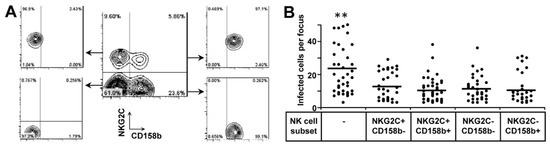 The HCMV glycoprotein UL40 can upregulate the cell surface expression of HLA-E which in turn is recognized by NKG2C [25,26]. It has been shown before that TB40/E carries a stop mutation in UL40 [27]. To exclude a possible effect of this mutation, we repaired the UL40 mutation in the background of BAC-4, which is derived from TB40/E. We sorted four different subpopulations of NK cells as effectors based on the expression of NKG2C and CD158b (Figure 4A). The same amount of NK cells from every subset was applied in the HCMV transmission inhibition assay. In this assay, four NK cell subsets inhibited the HCMV transmission to the same extent (Figure 4B). This indicates that NKG2C+ NK cells can inhibit the HCMV transmission in cell culture independent of CD158b expression.