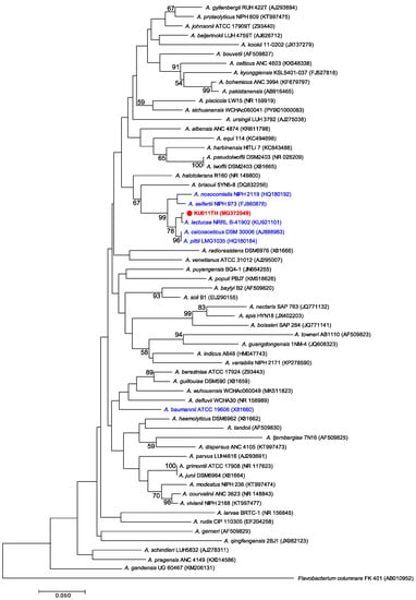 - Li, Y.; Chang, J.; Guo, L.M.; Wang, H.M.; Xie, S.J.; Piao, C.G.; He, W. Description of Acinetobacter populi sp. nov. isolated from symptomatic bark of Populus × euramericana canker. Int. J. Syst. Evol. Microbiol. 2015, 65, 4461–4468. [Google Scholar] [CrossRef] [PubMed]