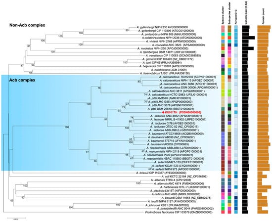Phylogenetic analysis based on the core genome of the bacterial strain KU011TH further indicated that the bacterial strain KU011TH belonged to the Acb complex cluster in the same subcluster as A. pittii. However, our results indicated that within the Acb complex, the bacterial strain KU011TH is genomically separated from its closely related species (A. pittii) as well as from the other non-Acb complex species of the genus Acinetobacter with valid published names. The results of the phylogenetic analysis based on the core genome of the Acb complex and non-Acb complex of the genus Acinetobacter are shown in Figure 3.