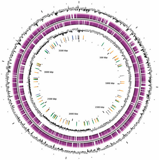 The general genomic characteristics for bacterial strain KU011TH and closely related type strains in the Acb complex are shown in Table 4. In this study, A5-miseq generated 27 contigs from the bacterial strain KU011TH. The genome size of the novel bacterial strain was approximately 3.79 Mbp, and the N50 value was 325. The approximate coverage depth of the assemblies was 172×. According to a MicroScope annotation scheme, the total number of CDSs, rRNAs and tRNAs in strain KU011TH was 3619, 8 and 63, respectively. Additionally, the genomic features and genome distribution pattern of the novel bacterial strain KU011TH are illustrated in Figure 4 and shown in Table 4, respectively. Furthermore, the G+C content of the bacterial strain KU011TH was 38.5 mol%, which is in the range from 34.9 to 47.0 mol% reported for members of the genus Acinetobacter and close to the G+C content of species of the Acb complex, including A. pittii (38.80 mol%), A. lactucae (38.80 mol%), A. calcoaceticus (38.70 mol%), A. nosocomialis (38.70 mol%), A. seifertii (38.60 mol%) and A. baumannii (38.90 mol%) (Table 4).