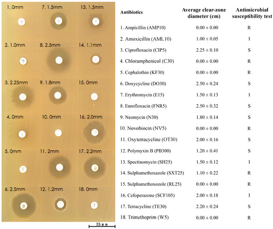 An antibacterial susceptibility test of the bacterial strain KU011TH was performed using the disk diffusion method [51,52]. The cultured bacterial suspension of 2.0 × 108 CFU/mL was grown and prepared as described above and then swabbed on MH agar plates. Commercial paper antibiotic disks with fixed concentrations were placed on the inoculated agar surface. Eighteen antibiotics obtained from Thermo ScientificTM were used in this study, namely, ampicillin (AMP10), amoxicillin (AML10), ciprofloxacin (CIP5), chloramphenicol (C30), cephalothin (KF30), doxycycline (DO30), erythromycin (E15), enrofloxacin (FNR5), neomycin (N30), novobiocin (NV5), oxytetracycline (OT30), polymyxin B (PB300), spectinomycin (SH25), sulfamethoxazole (SXT25), sulfamethoxazole (RL25), cefoperazone (SCF105), tetracycline (TE30) and trimethoprim (W5). The plates were incubated for 18–24 h at 37 °C prior to determination of the results. After incubation, the clear zones of growth inhibition around each of the antibiotic disks were measured in millimeters. The diameter of the clear zone is related to the susceptibility of the isolate, which was interpreted using the criteria published by the Clinical and Laboratory Standards Institute (CLSI) [52]. The results were qualitatively classified into three categories of susceptibility: susceptible, intermediate, and resistant. The test was performed in three replications.