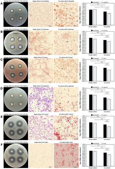 To confirm the predominant antagonistic activities of the novel bacterial strain toward various fish pathogens, growth inhibition through interactions between strain KU011TH and pathogens in coculture conditions was further addressed. The inhibitory effects of the bacterial strain KU011TH on pathogen growth were strongly observed in freshwater fish pathogens. In particular, coculture significantly decreased the growth of A. hydrophila (p < 0.05), F. columnare (p < 0.01), F. roseus (p < 0.01), S. agalactiae, S. warneri (p < 0.01) and E. tarda (p < 0.01) compared to their growth in single cultures (Table 8). Changes in the cell morphology of cocultured bacteria were observed for F. columnare, A. hydrophila and E. tarda, which exhibited fragile cells and accumulation of inactive cells during coculture compared with their single cultures (Figure 6).